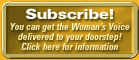 or photography within this publication. Any questions or comments regarding contents should be directed to: The Woman's Voice Magazine, PO Box 11604, Pleasanton, CA 94588. All contents are the opinions of the individual authors or contributors, and do not necessarily represent the views of the editors or the staff of the Woman's Voice Magazine. All materials © 2002 the author and/or Woman's Voice Magazine. All rights reserved. No material may be copied without the permission of the publisher. For more information, please call the Woman's Voice Magazine at 925-785-4242. |